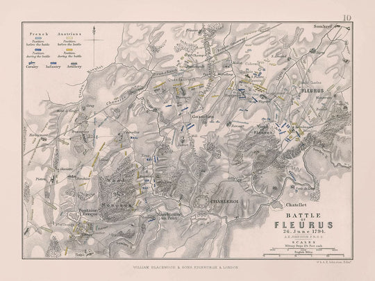 Presentamos la "Batalla de Fleurus, 26 de junio de 1794" de AK Johnston, una litografía antigua en color con gran detalle que encapsula un momento crucial en la historia militar europea. Grabado por W. & AK Johnston y encargado como parte de la "Historia de Europa" de Sir Archibald Alison, esta obra de arte ofrece un cuadro dinámico de la guerra estratégica durante batallas importantes desde la época de la Revolución Francesa hasta la restauración de los Borbones.