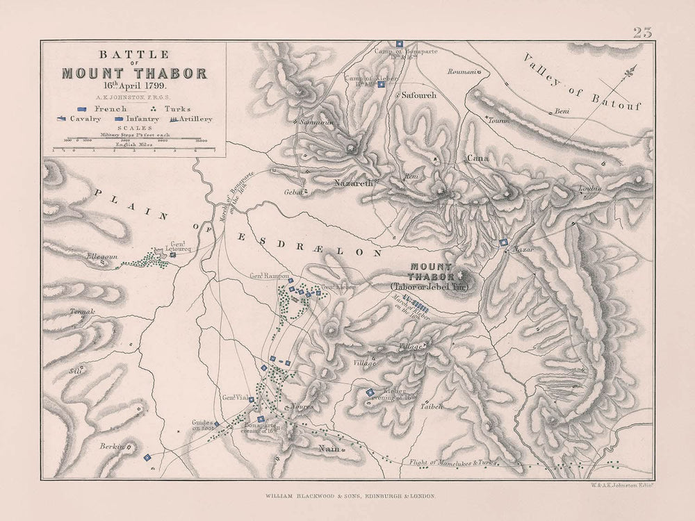 Presentamos la detallada "Batalla del Monte Thabor, 16 de abril de 1799", una litografía histórica que representa las maniobras estratégicas de las fuerzas francesas y turcas en este importante campo de batalla. Realizada por el estimado AK Johnston en 1799, este antiguo grabado coloreado a mano captura de manera hermosa la disposición de la caballería, la infantería y la artillería, envuelta en las complejidades de la guerra grabadas en el paisaje histórico.