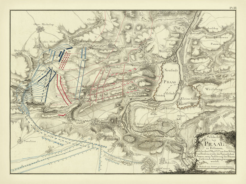 Presentamos "La Batalla de Praga" (1778) de un artista anónimo, que muestra un momento crucial en la historia militar europea a través de un grabado en cobre bellamente intrincado. Esta obra de arte, titulada originalmente "Schlacht bey Praag, in Böhmen, welche den 6. May 1757. von dem Koenig von Preussen, wieder der Kayserlichen Armee, unter Anführung des Prinzen Carls von Lothringen, gewonnen worden," ofrece un relato visual detallado de la Batalla de Štěrbohol, un evento crítico durante la Guerra de los Siete Años.