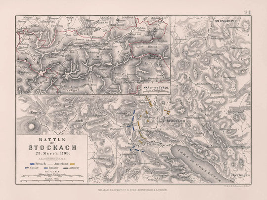 Explora el rico tapiz de la historia con "Batalla de Stockach" de AK Johnston, una intrincada litografía antigua en color que representa las escaramuzas cruciales de 1799. Grabado por el distinguido W. & AK Johnston en Edimburgo, este detallado mapa de batalla es un verdadero testimonio de la cartografía histórica. Una característica especial de esta obra de arte incluye un mapa insertado del Tirol, que muestra las posiciones estratégicas ocupadas por los ejércitos francés y austríaco, con caballería, infantería y artillería indicadas.