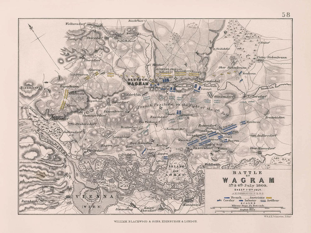 AK Johnston fue parte integral del arte de la cartografía a principios del siglo XIX, publicando extensamente mapas y atlas que fueron esenciales para comprender las geografías históricas. La litografía "Batalla de Wagram" es particularmente notable por sus intrincados detalles, que reconstruyen vívidamente los movimientos de las unidades francesas y austriacas. La importancia histórica de la obra de arte se ve acentuada por la representación precisa de las estrategias militares que se llevaron a cabo durante las campañas de Napoleón Bonaparte, que abordan las complejidades de la historia europea de principios del siglo XIX.