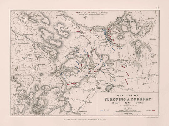 El Batallas de Turcoing y Tournay, 18 y 22 de mayo de 1794 Este mapa, creado en 1794 por AK Johnston, ofrece una mirada cautivadora al drama histórico de las guerras revolucionarias francesas. Este mapa grabado a mano y coloreado a mano con un nivel de detalle excepcional muestra los planes de batalla críticos ejecutados durante estos enfrentamientos cruciales. Deléitese examinando los intrincados detalles que resaltan las formaciones de caballería, infantería y artillería de las fuerzas francesas y aliadas, con el relieve terrestre representado hábilmente a través de sombreados para una experiencia verdaderamente topográfica. Cada posición estratégica es más que un simple punto en un mapa, sino una narrativa de los tiempos que involucraron esfuerzos valientes y genio militar.