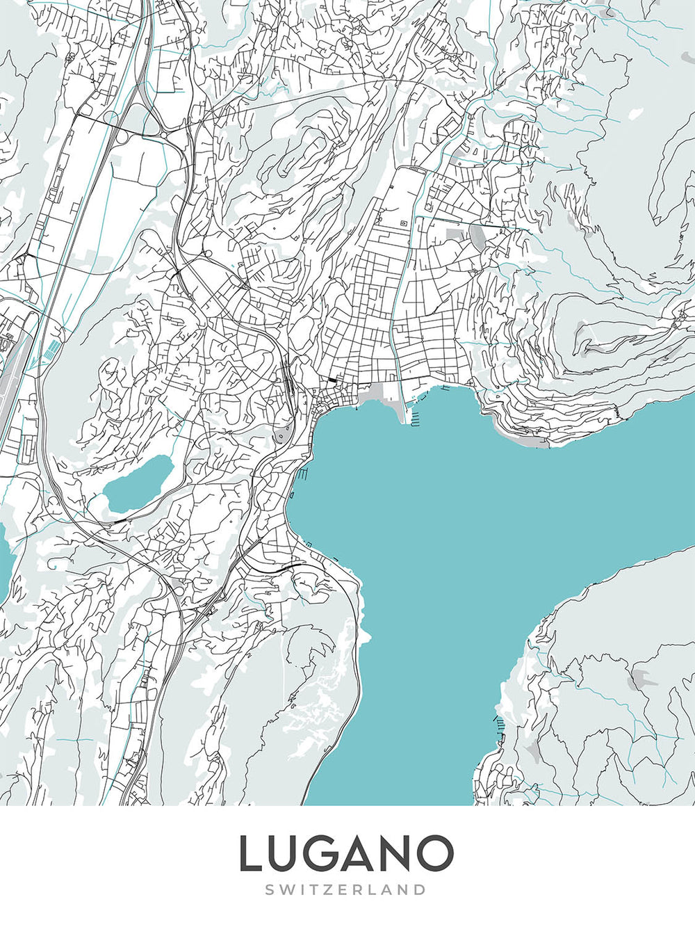 Este mapa de Lugano es un callejero moderno y detallado sin etiquetas, centrado en la ciudad y sus alrededores. Cubre una amplia zona, incluido el centro de la ciudad, los barrios circundantes y las montañas y lagos cercanos. El mapa está diseñado para ser informativo y visualmente atractivo, lo que lo convierte en una excelente adición a cualquier hogar u oficina.