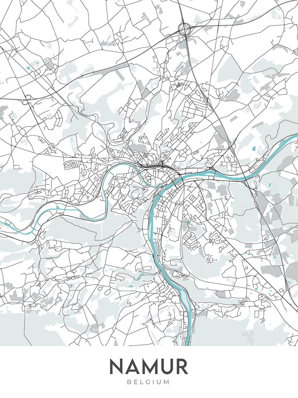 Este mapa de Namur, Bélgica, es una obra de arte cartográfica moderna y detallada perfecta para cualquier hogar u oficina. El mapa se centra en la ciudad de Namur y se extiende para incluir el campo circundante. El mapa está dibujado en un estilo moderno, centrándose en líneas limpias y formas simples. La paleta de colores es apagada y en tonos tierra, lo que le da al mapa un aspecto sofisticado y atemporal.