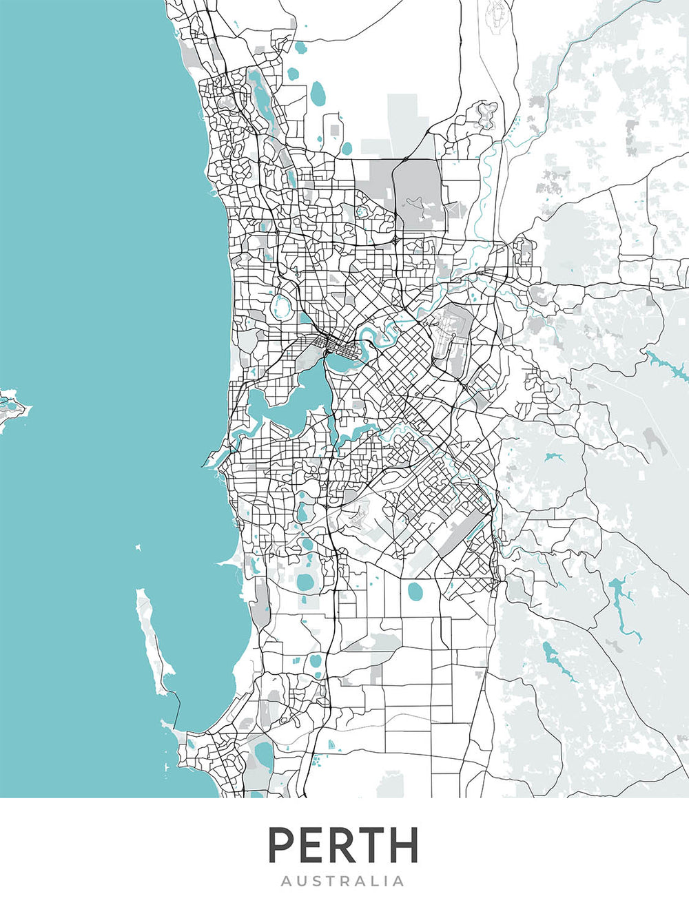 Este mapa de Perth es una obra de arte cartográfica moderna y detallada que se centra en la expansión urbana del centro de la ciudad y sus suburbios circundantes. El mapa se centra en el distrito central de negocios (CBD), que alberga muchos de los lugares más emblemáticos de la ciudad, incluido el CBD de Perth, Kings Park y el Jardín Botánico y la Universidad de Australia Occidental. El CBD es también un importante centro de transporte, con varias estaciones de tren y autobús ubicadas dentro de sus límites.