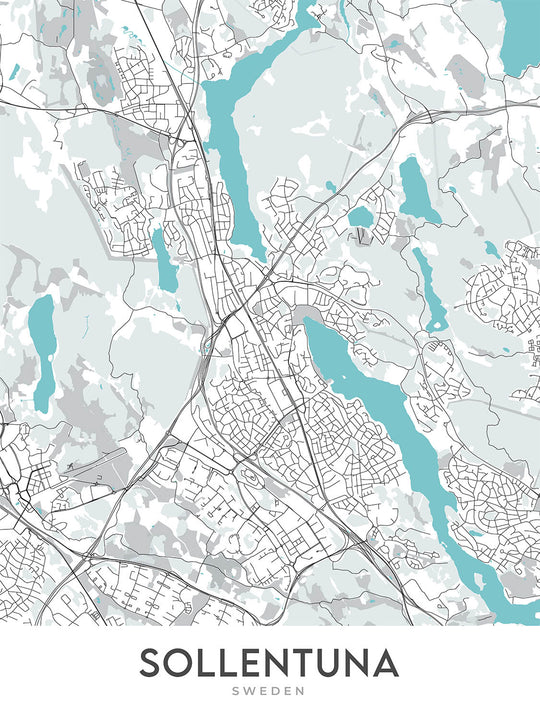 Este mapa de Sollentuna, Suecia, es una obra maestra moderna que captura la esencia del diseño escandinavo. Las líneas limpias y los colores apagados del mapa crean una pieza visualmente impresionante que complementará cualquier hogar u oficina. El mapa se centra en la zona de Sollentuna, conocida por sus hermosos paisajes, barrios encantadores y su rica historia.