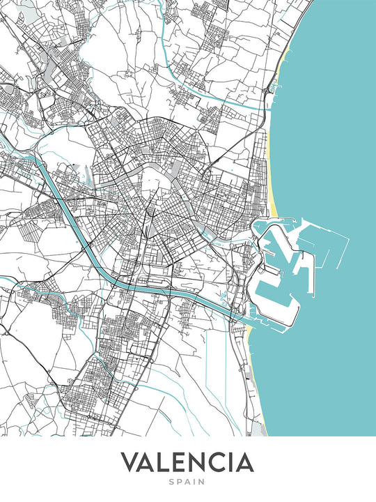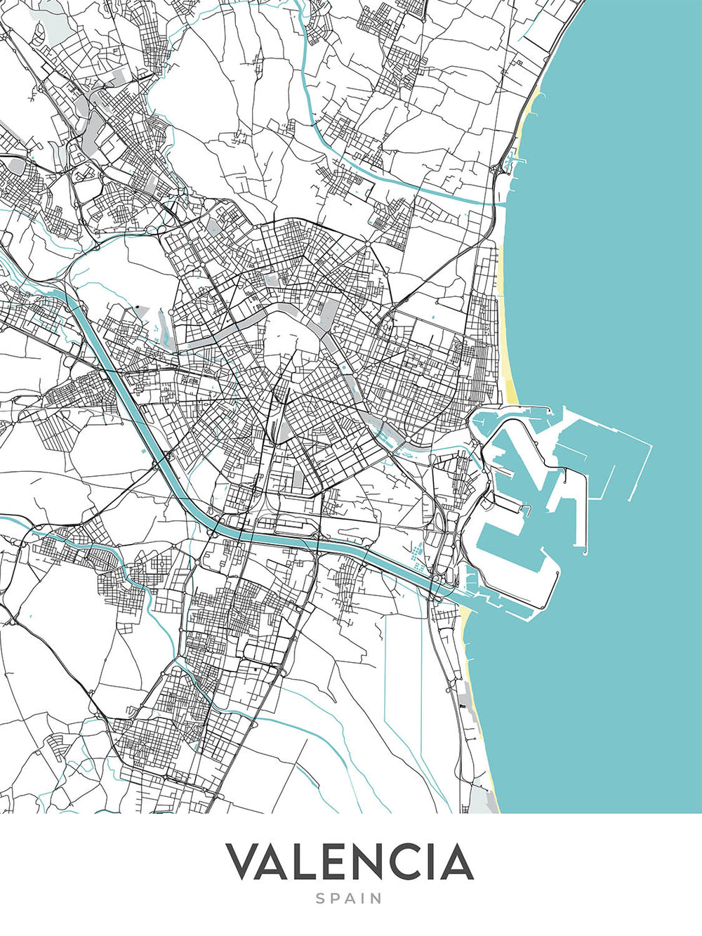 Mapa moderno de la ciudad de Valencia, España: Ciutat Vella, El Carmen, Ruzafa, Ciudad de las Artes y las Ciencias, Jardines del Turia