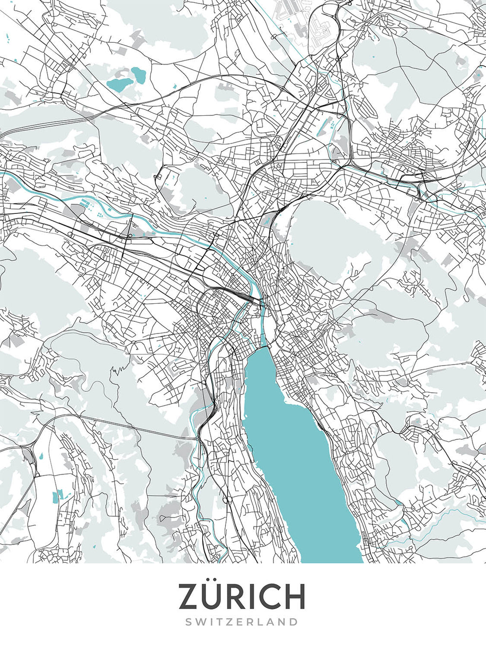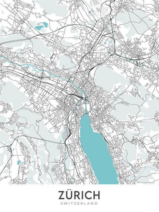 Este mapa de Zúrich, Suiza, es una obra de arte cartográfica moderna y detallada, perfecta para cualquier hogar u oficina. El mapa se centra en la ciudad de Zúrich y sus alrededores, proporcionando una visión completa de esta región vibrante y dinámica. El mapa cubre una amplia gama de barrios, incluidos Altstadt (casco antiguo), Enge, Fluntern, Hirslanden, Hottingen, Leimbach, Oberstrass, Oerlikon, Seefeld, Sihlfeld, Wiedikon, Wipkingen, Wollishofen y Zurich-West.