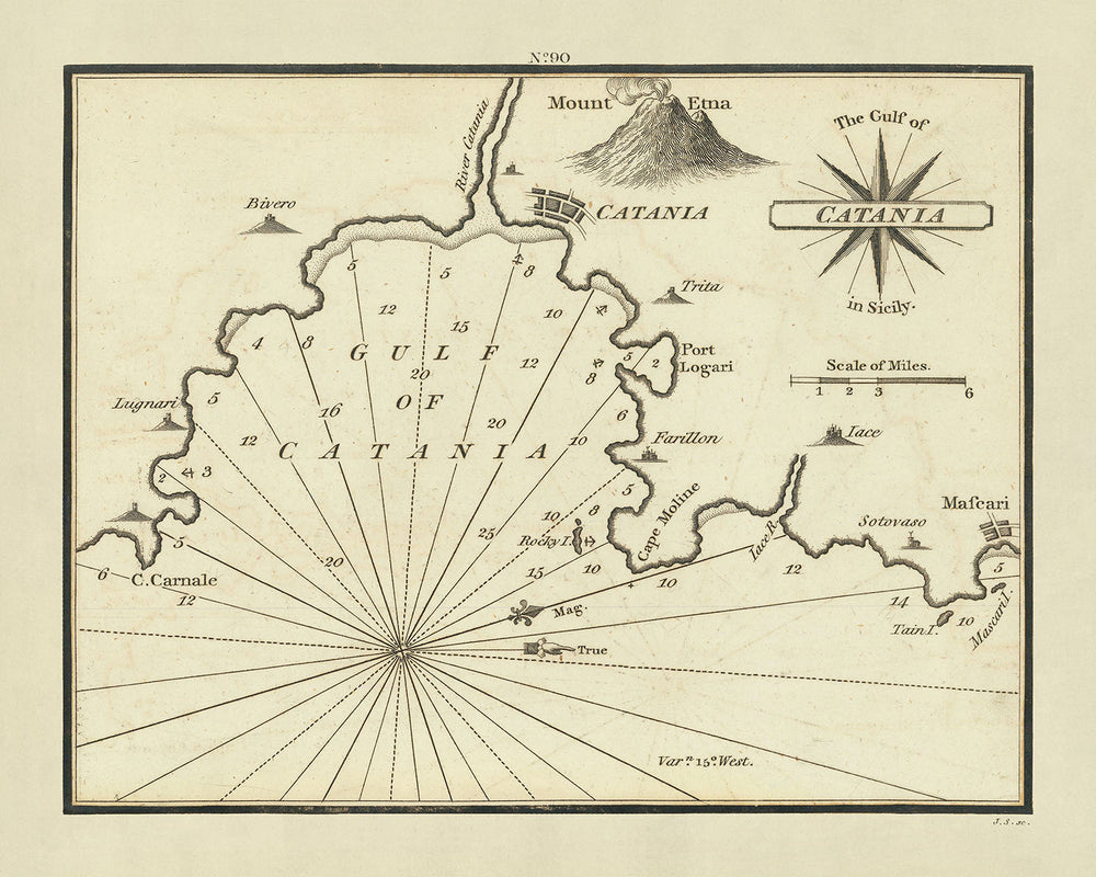 Este mapa se distingue por su orientación, con el oeste en la parte superior, una característica única que lo diferencia de los mapas convencionales. Detalla meticulosamente la costa del Golfo de Catania, marcando lugares significativos como Catania misma, Aci Castello y Aci Trezza. Notablemente, captura la majestuosa presencia del Monte Etna, un hito icónico cuya representación añade tanto profundidad geográfica como cultural al mapa. La inclusión de sondas, características topográficas y anclajes enriquece su utilidad y valor histórico, convirtiéndolo en un recurso indispensable para entender el paisaje marítimo de la época.