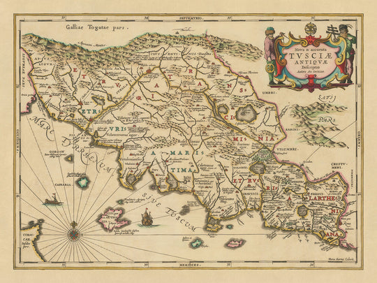 La 'Nova et accurata Tusciae Antiquae Descriptio' es una representación cautivadora de la antigua Toscana, una región impregnada de historia y cultura. Publicada en 1652 por el estimado cartógrafo Jan Jansson, este mapa ofrece una vista completa de la Toscana, conocida como Etruria en la antigüedad. El mapa se extiende para incluir partes de Lacio y Umbría, ofreciendo una perspectiva más amplia del contexto geográfico de la región. Notablemente, el mapa presenta una vista detallada de los Apeninos y el río Arno, características topográficas integrales que moldearon el desarrollo de los asentamientos antiguos de la región.