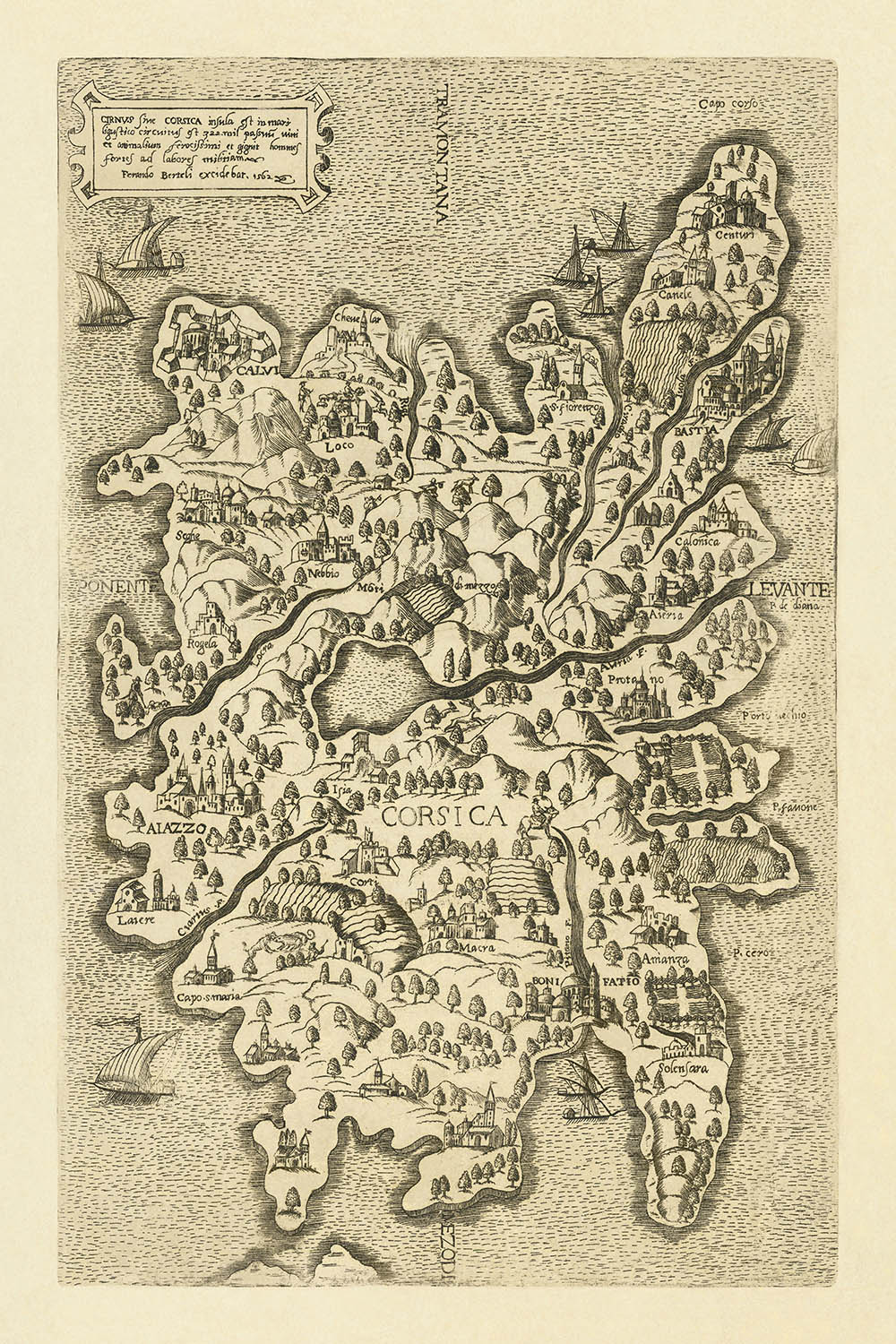 Mapa antiguo de Córcega por Bertelli, 1562: Atlas antiguo, Bastia, Bonifacio, veleros elegantes, campos cultivados