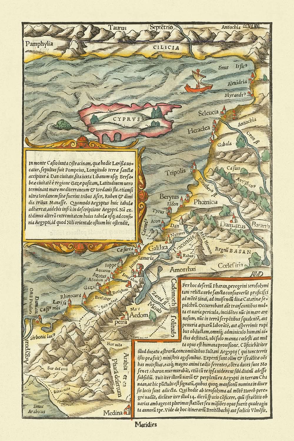 Antigua mapa de Chipre y Tierra Santa por Münster, 1554: Jerusalén, Monte Sinaí, Medina, montes Tauro