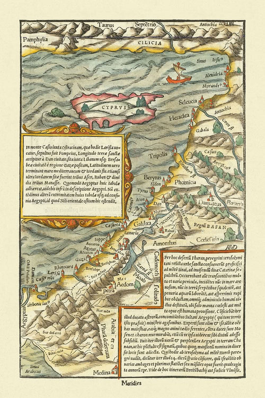 La obra de Münster no es una mera representación geográfica, sino una narración de exploración y descubrimiento. El mapa muestra los majestuosos montes Tauro, el venerado monte Sinaí y el extenso mar Mediterráneo, entrelazando maravillas naturales con asentamientos humanos. Cada elemento del mapa cuenta una historia de la tierra, su gente y la interconexión del mundo antiguo. El mapa sirve como documento histórico, preservando el conocimiento y las aspiraciones de una época en la que el mundo todavía estaba siendo cartografiado.
