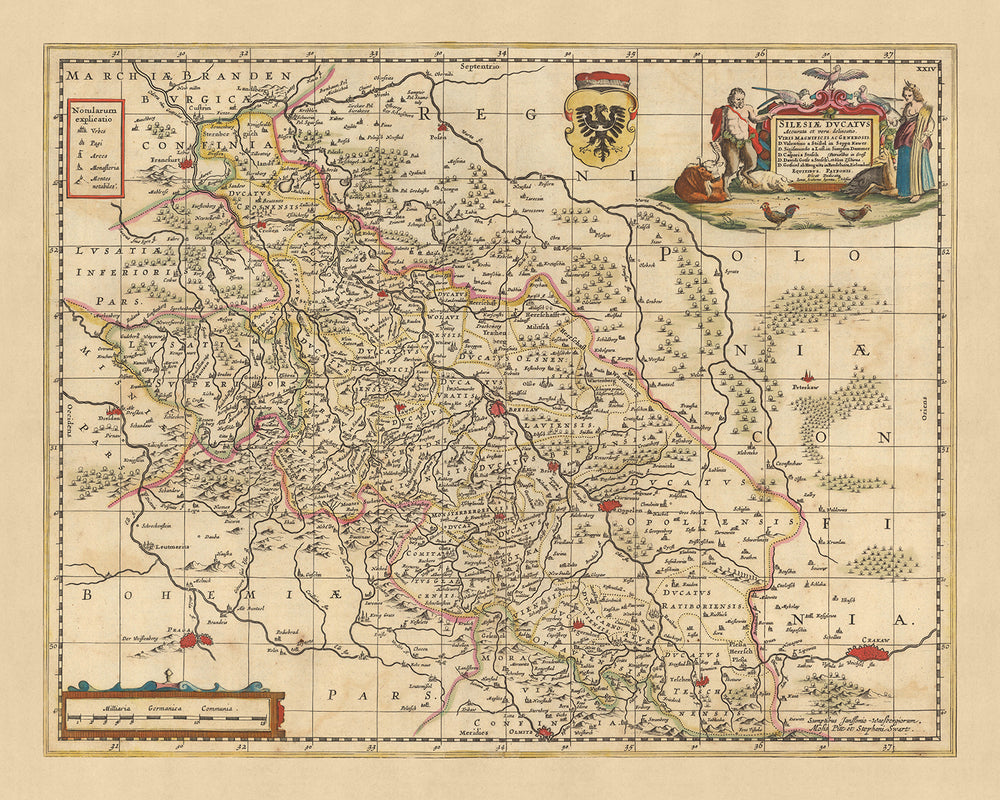 Sumérgete en la rica historia del Ducado de Silesia con este exquisito mapa, meticulosamente elaborado por Nicolaes Visscher II en 1690. El mapa, cuyo nombre completo 'Silesiae Ducatus Accurata et vera delineatio' se traduce como 'Representación precisa y fiel del Ducado de Silesia', ofrece una visión cautivadora de las divisiones políticas de la región a finales del siglo XVII. Visscher, una figura destacada de la Edad de Oro holandesa de la cartografía, ha detallado detalladamente las distintas regiones del Ducado, ofreciendo una perspectiva única del paisaje histórico de lo que hoy es Polonia y la República Checa.