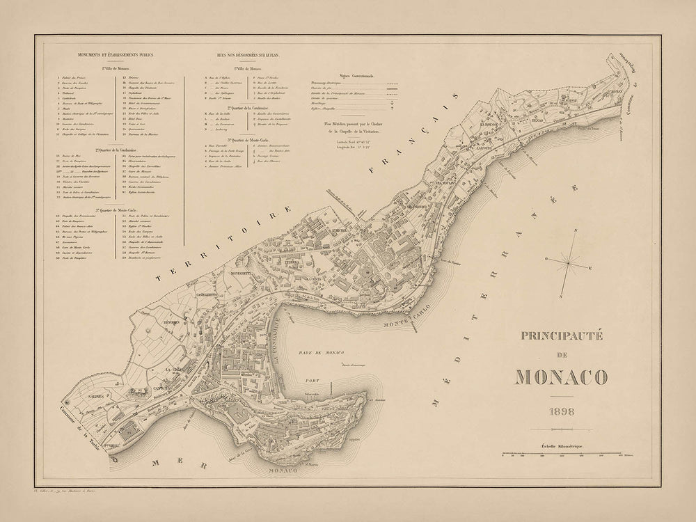 La experiencia de C. Gillot en cartografía es evidente en la precisión y el arte de este mapa. Conocido por sus detallados mapas de ciudades, Gillot captura la esencia del paisaje urbano de Mónaco con notable claridad. Su trabajo proporciona valiosas perspectivas sobre el diseño de la ciudad, desde las bulliciosas calles como el Boulevard de la Condamine hasta los serenos caminos del Chemin des Rêvoires, ofreciendo una visión completa de la evolución geográfica e infraestructural del principado.