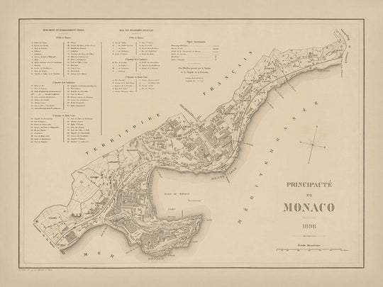 El mapa de la "Principauté de Mónaco", elaborado por el estimado C. Gillot en 1898, es una fascinante visión del tejido urbano de Mónaco a finales del siglo XIX. Esta obra maestra en blanco y negro no solo delinean las intrincadas calles e infraestructuras del principado, sino que también destaca la presencia de tranvías eléctricos, un testimonio de la temprana adopción del transporte público moderno en Mónaco. El detallado trabajo de líneas y la inclusión de una rosa de los vientos realzan su encanto navegacional, convirtiéndolo en un valioso artefacto tanto para historiadores como para entusiastas de la cartografía.