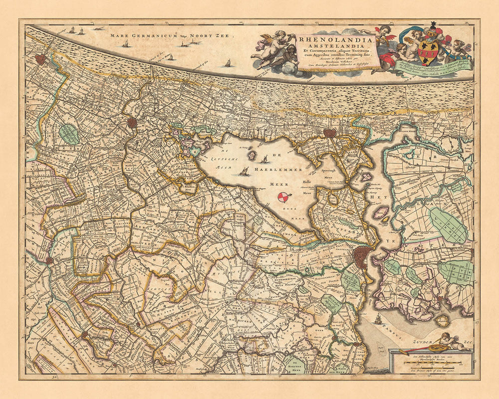 El mapa destaca varias ciudades importantes de la época y ofrece una perspectiva histórica única sobre su desarrollo inicial. Ámsterdam, la capital de los Países Bajos, ocupa un lugar destacado, lo que refleja su condición de centro político, económico y cultural. También se representa Haarlem, una ciudad famosa por su rica historia en arte y cultura, lo que permite vislumbrar su vibrante pasado. El mapa también incluye La Haya, la sede del gobierno holandés y del Rey, junto con Leiden y Gouda, ambas ciudades importantes conocidas por su importancia histórica y cultural.