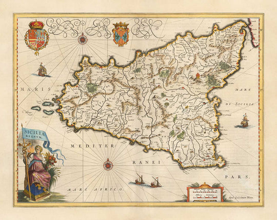 Esta maravillosa antigua mapa de Sicilia fue publicada originalmente en 1640. Fue creada por Willem Blaeu.