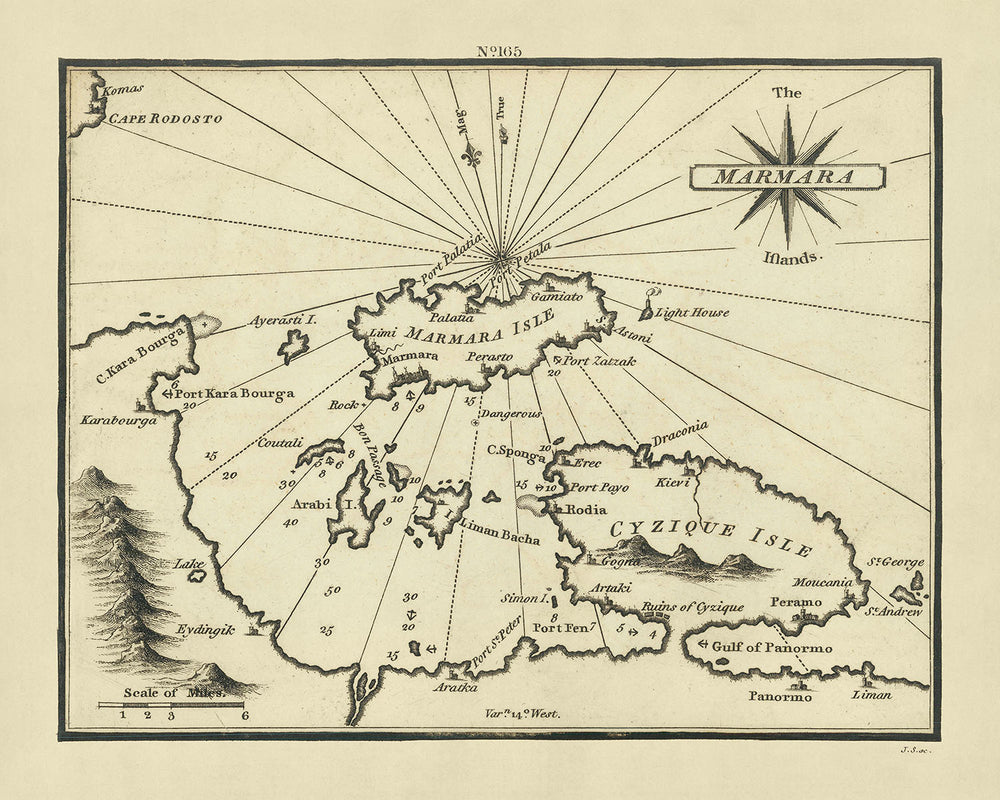 Detalles y Estilo Cartográfico Elaborado con un ojo agudo para los detalles, el mapa presenta un diseño orientado al norte, que era típico de los mapas náuticos de la época. Incluye una barra de escala y una leyenda, mejorando su utilidad y valor histórico. El diseño y estilo reflejan el compromiso de Heather con la precisión y la estética, convirtiéndolo no solo en una herramienta de navegación, sino también en una obra de arte. El grabado es fino y detallado, permitiendo una clara visibilidad de los elementos geográficos y náuticos, que son cruciales para entender la importancia estratégica del Mar de Marmara como ruta comercial histórica.