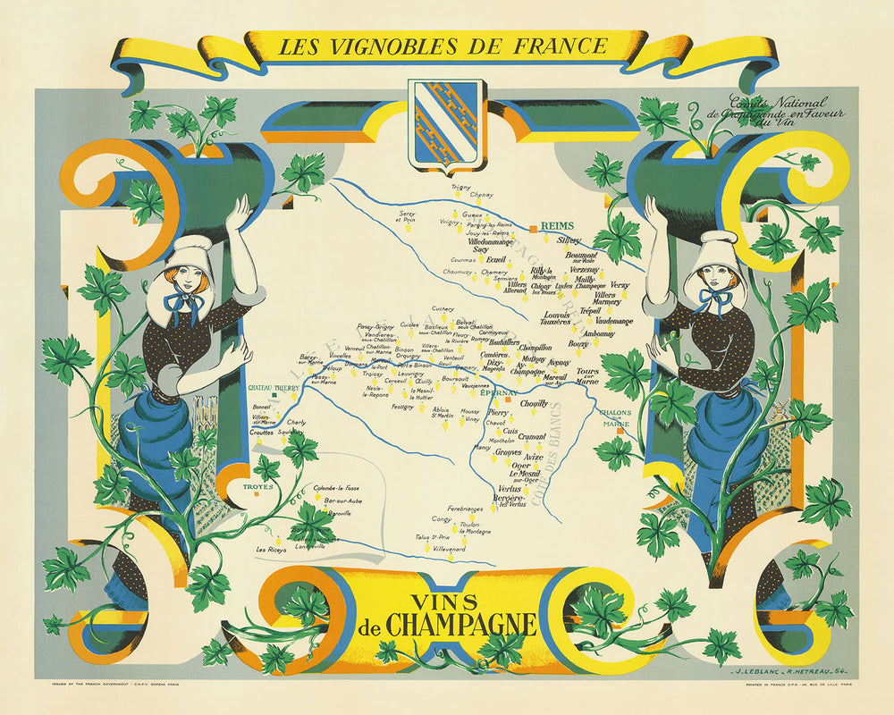 Rémy Hetreau, conocido por sus grabados al aguafuerte e ilustraciones de libros, aporta su estilo artístico único a este mapa. Su trabajo en esta serie de mapas, que incluye diseños para porcelana Haviland de Limoges y murales en la Maison de l'Amerique Latine de París, muestra su versatilidad y dedicación al arte y la cultura franceses. El mapa está adornado con una rosa de los vientos, bordes decorativos con vides y encantadoras ilustraciones de mujeres con atuendos tradicionales, todo lo cual se suma a su atractivo visual y significado histórico.