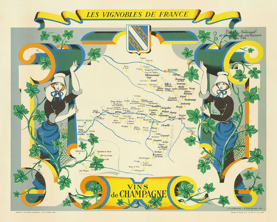 Les Vignobles De France - Vins De Champagne, creado por el reconocido artista francés Rémy Hetreau en 1954, es una representación cautivadora de la región vinícola de Champagne. Este mapa es parte de una serie encargada por el Comité National de Propagande en Faveur du Vin, una agencia gubernamental dedicada a promover la industria vinícola francesa. La destreza artística de Hetreau es evidente en las ilustraciones detalladas que resaltan las principales áreas productoras de vino, con racimos de uvas que simbolizan los vinos tintos y blancos. El mapa no solo sirve como guía de la región de Champagne, sino también como una hermosa obra de arte que refleja el rico patrimonio cultural de la vinificación francesa.