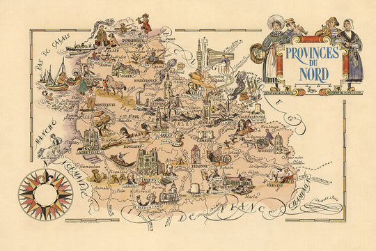 El diseño del mapa "Provinces du Nord" es una combinación armoniosa de elementos artísticos y temáticos. La decorativa rosa de los vientos, orientada con el norte hacia el margen superior izquierdo, aporta un toque de elegancia, mientras que el relieve pictórico da vida al paisaje. El mapa está adornado con ilustraciones de artesanías tradicionales, actividades marítimas y escenas agrícolas, que reflejan los diversos aspectos culturales y económicos de la región del Norte. Las representaciones artísticas de monumentos históricos, como catedrales y castillos, realzan aún más el atractivo visual y la importancia histórica del mapa.