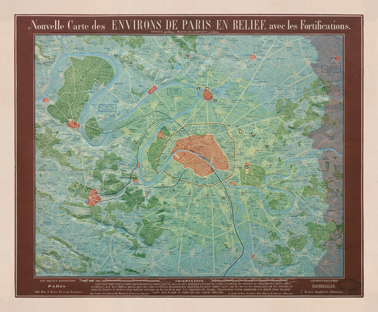 Sumérgete en la rica historia de la capital francesa con este cautivador mapa en relieve antiguo de París, meticulosamente elaborado por el renombrado cartógrafo Georg Bauerkeller a mediados del siglo XIX. Esta obra maestra cartográfica antigua no solo muestra la ciudad de París, sino que también detalla detalladamente las regiones circundantes, presentando una instantánea vívida del área durante una época de grandes cambios e innovación. Con sus intrincados detalles y su significado histórico, este mapa es imprescindible para los entusiastas de la historia, los aficionados a la cartografía y los amantes de París por igual.