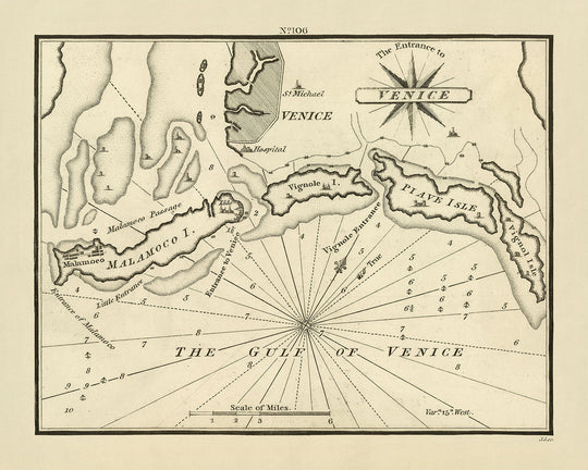 El mapa de Heather es un testimonio de los avances en la cartografía náutica de su tiempo. Está ricamente adornado con sondeos, anclajes y un meticuloso plano del pueblo, proporcionando una vista completa de la región costera. Notablemente, el mapa incluye las ubicaciones de Malamocco, el Lido y el Arsenal Veneciano, cada uno significativo por sus roles en la historia marítima y militar. La inclusión del río Piave y el Golfo de Venecia complementa aún más el extenso detalle del mapa, convirtiéndolo en un recurso indispensable para entender la geografía y la importancia naval de Venecia.