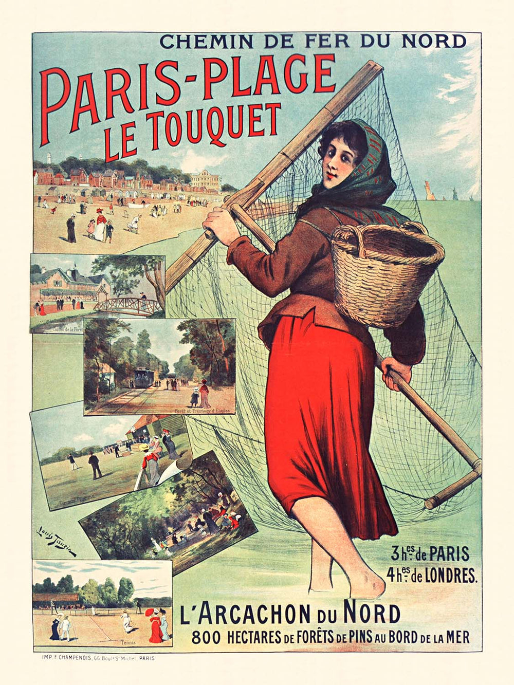 Paris-place le Touquet by Louis Tauzin (1900) is a quintessential Belle Époque travel poster, created at the moment when France’s Art Nouveau sensibility met the new leisure culture of seaside holidays. Set on the north coast at Le Touquet-Paris-Plage, the image brims with life: sunlit sands, sea air, and the carefree motion of beachgoers. Tauzin’s composition leads with a lively figure in a striking red skirt, framed by fresh coastal greens and open blues, evoking the allure of a modern resort reachable by rail from Paris.
