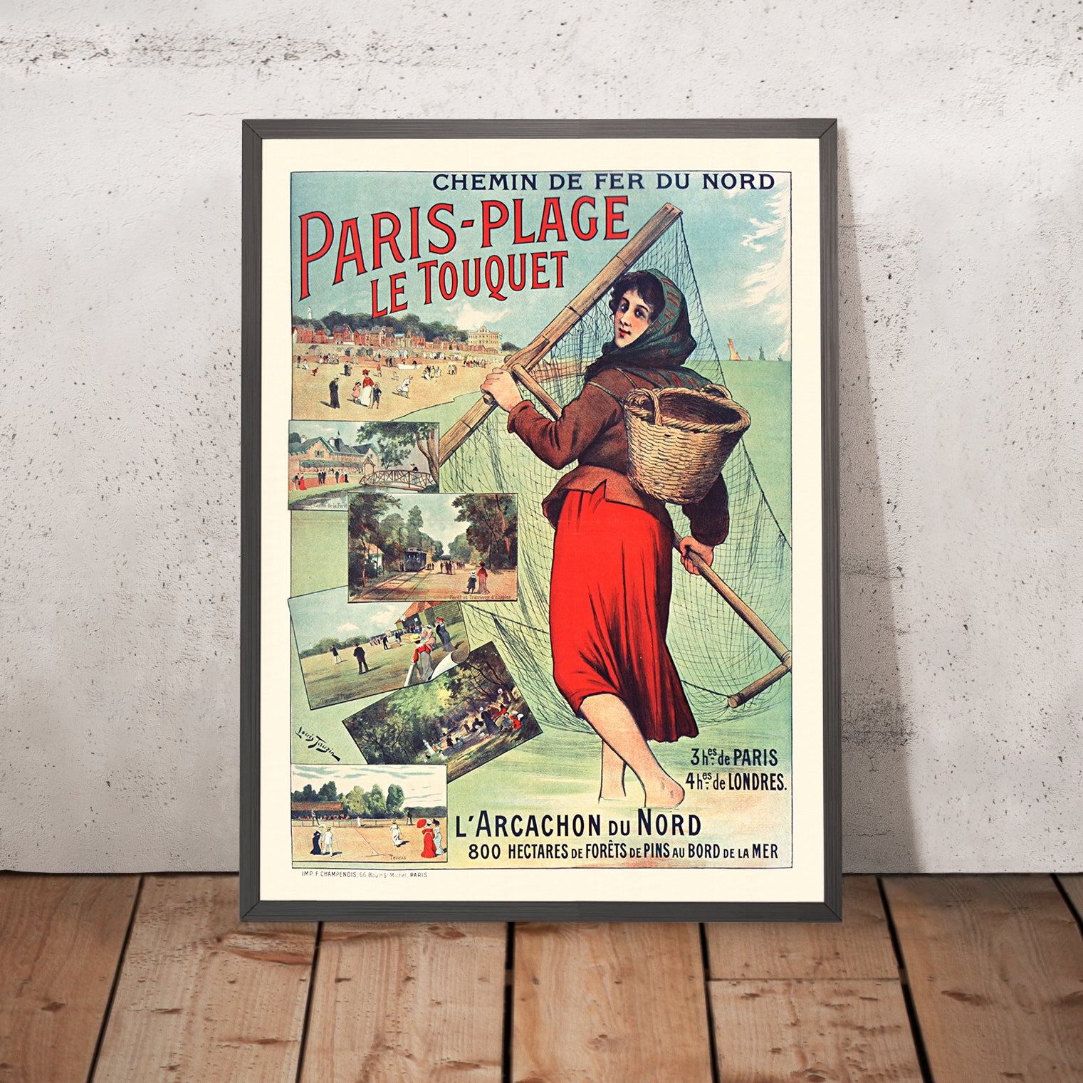About the place: Le Touquet-Paris-Plage rose to prominence in the late 19th and early 20th centuries as a smart resort nestled among dunes and pine forests on the Opal Coast. It became a seaside playground for Parisians and visitors from across the Channel, reflecting a broader cultural shift toward outdoor leisure, healthful sea bathing, and weekend escapes. This poster crystallizes that era—when railways made distant shores feel stylishly within reach—making it a compelling memento for anyone who has strolled its beaches or fallen for northern France’s luminous light.