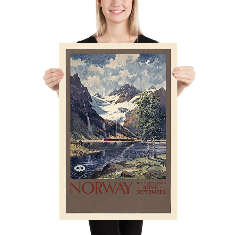 Why this subject matters: In the interwar years, Norway actively promoted summer travel to fjords and coastal towns, when long daylight and reliably calmer seas welcomed visitors. This poster’s seasonal callout—June to September—speaks to that moment in travel history, when modern steamships and rail links made the country newly accessible. The image celebrates national identity through landscape, aligning adventure with serenity and inviting travelers to linger in the blue‑green hush of the fjords.