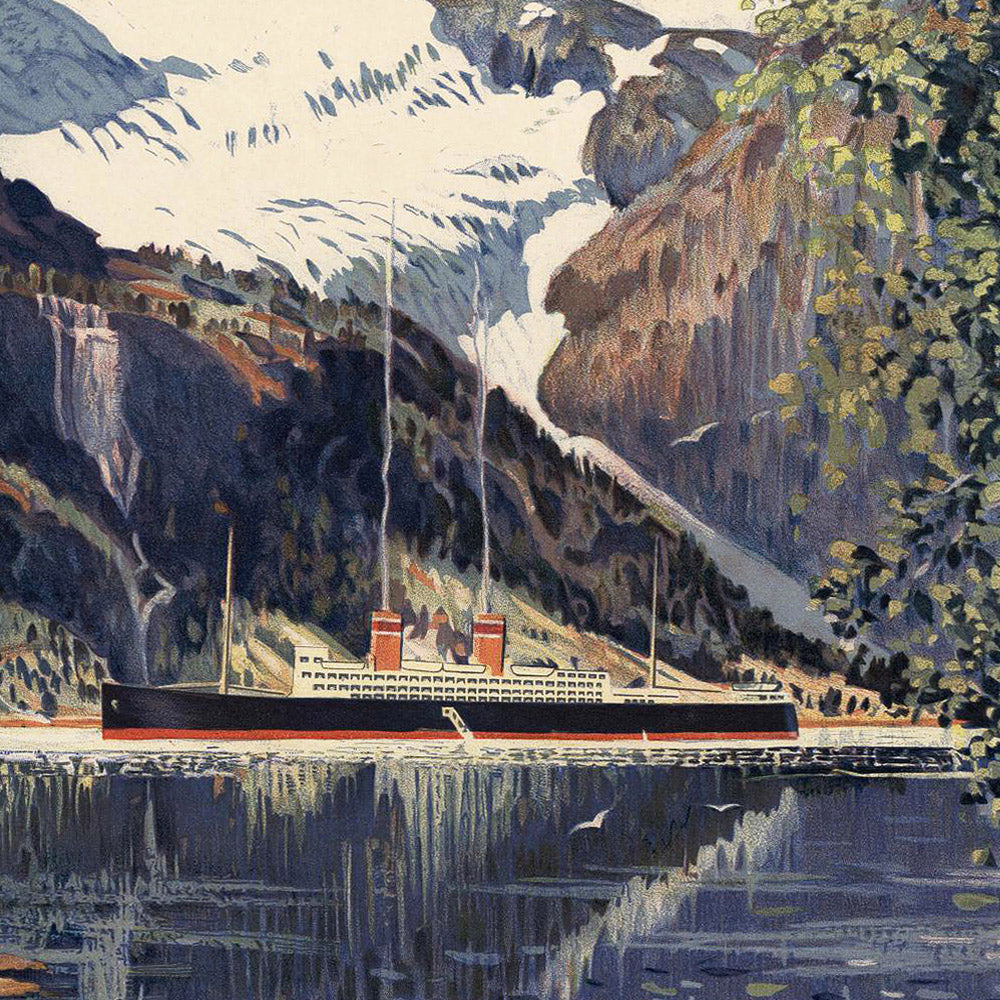 About the artist: Ben Blessum is known for bridging fine art and graphic design during the golden age of travel, translating Norway’s rugged coasts and soaring peaks into images that resonated with international audiences. Working across painting, illustration, and poster art, his compositions drew on first‑hand knowledge of maritime life and alpine light, making his work both persuasive as advertising and captivating as art.
