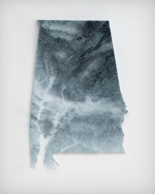 Desde las tierras boscosas cerca de Huntsville hasta la tranquila Bahía de Mobile, cada región cobra vida con un realismo sorprendente. El juego de luz sobre las cumbres montañosas y el delicado sombreado en los valles inferiores no solo resalta la elevación, sino que también captura el espíritu distintivo del aire libre de Alabama. Esta pieza es ideal para cualquiera que aprecie la variada belleza de Alabama—ya sea tu hogar, un destino atesorado, o un regalo para alguien que lleva el Corazón de Dixie cerca.
