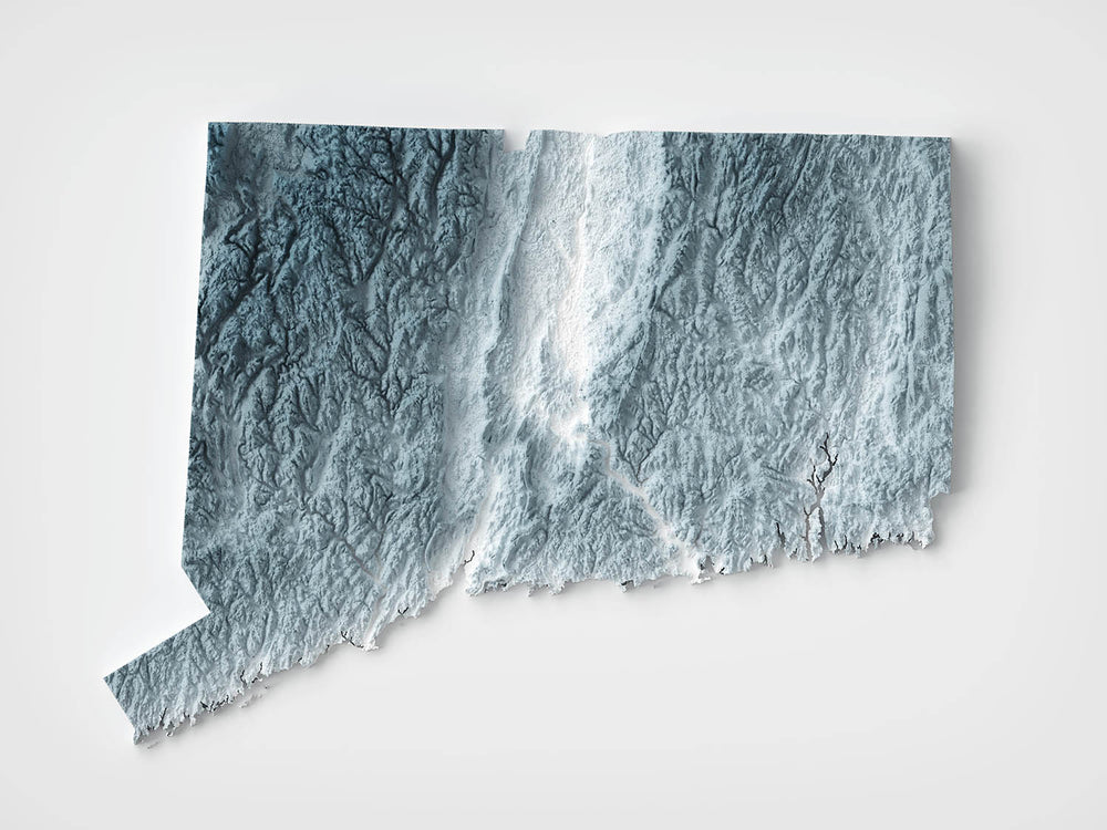 Descubre Connecticut, una sorprendente mezcla de colinas ondulantes y llanuras costeras bajas, representadas con un detalle exquisito. Este mapa traza cada matiz de la variada topografía del estado: desde las suaves colinas de Litchfield en el noroeste, donde las crestas y los valles están esculpidos en un agudo relieve por la interacción de la luz y la sombra, hasta el atractivo barrido del Valle del Río Connecticut que se abre paso por el centro, anclando el paisaje con su amplia y fértil llanura.