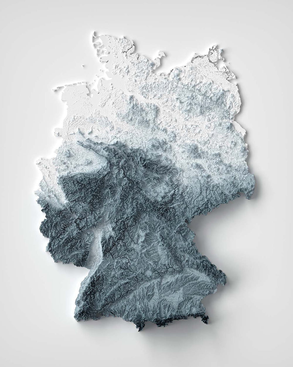La geografía de Alemania es un tapiz de contrastes: el sur está definido por imponentes cumbres alpinas y brillantes valles glaciares, sus altiplanos modelados con precisión por un sombreado nítido. Al moverte hacia el norte, la tierra se abre en extensas mesetas y fértiles valles fluviales, incluyendo el sinuoso Rin, el Danubio y el Elba, cuyos caminos tallados están elegantemente trazados en la superficie del mapa. La alta tierra central, con su Bosque de Turingia y las colinas volcánicas de Eifel y Hunsrück, emerge con una riqueza táctil, enfatizando los sutiles cambios que hacen que estas regiones sean únicas.