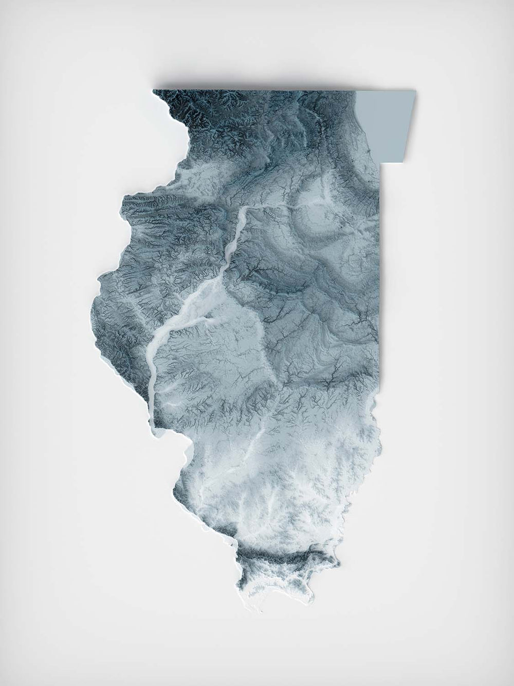 Celebra el corazón de América con esta exquisita representación de Illinois — un estado donde las llanuras extensas se encuentran con las crestas esculpidas por glaciares, y los valles fluviales tallan profundas historias en el paisaje. El mapa revela la geografía característica de Illinois con un uso dramático de sombra y luz para dar vida a las suaves ondulaciones y sutiles cambios de elevación.
