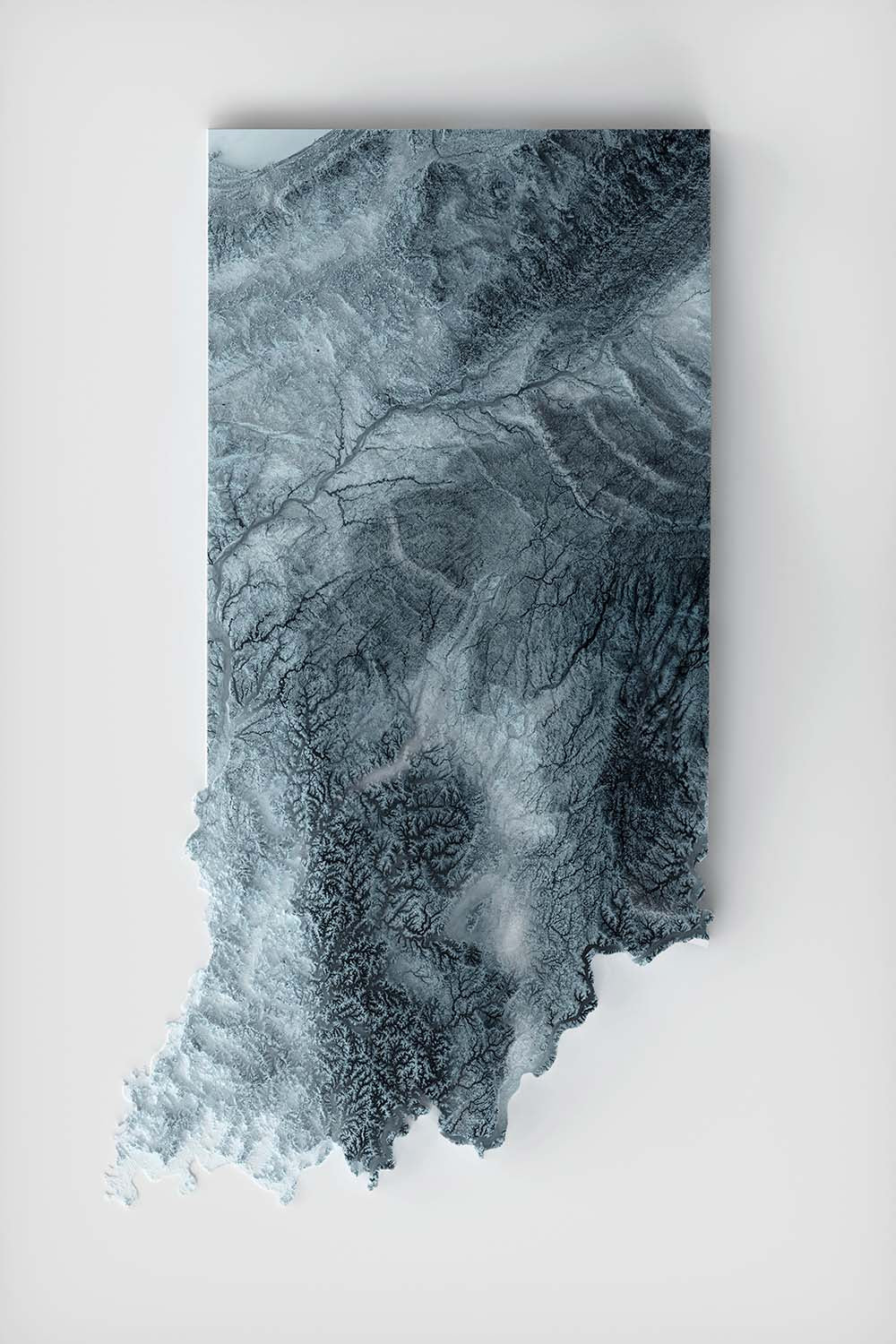 Al moverte hacia el sur, el terreno se transforma gradualmente. La luz y la sombra revelan el sutil ascenso de la Llanura de Tipton antes de tallar a través del terreno accidentado y montañoso del sur de Indiana. Aquí, los dramáticos contornos del Escarpe de Knobstone destacan, sus distintivas crestas resaltadas por contrastes nítidos que enfatizan el audaz relieve de la región y los valles profundos.