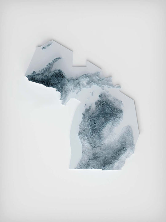 Celebra la grandeza natural de Michigan con un impresionante mapa que captura la espectacular geografía del estado en intrincados detalles. Las dos penínsulas de Michigan—la Península Inferior en forma de manopla y la Península Superior, escarpada y boscosa—se muestran con contornos y elevaciones amplias, cobrando vida a través del delicado uso de la luz y la sombra. Un modelado sutil resalta el ascenso y la caída de la tierra, desde las colinas y valles ondulantes del norte de la Península Inferior hasta los dramáticos y rocosos acantilados de la Península Superior.