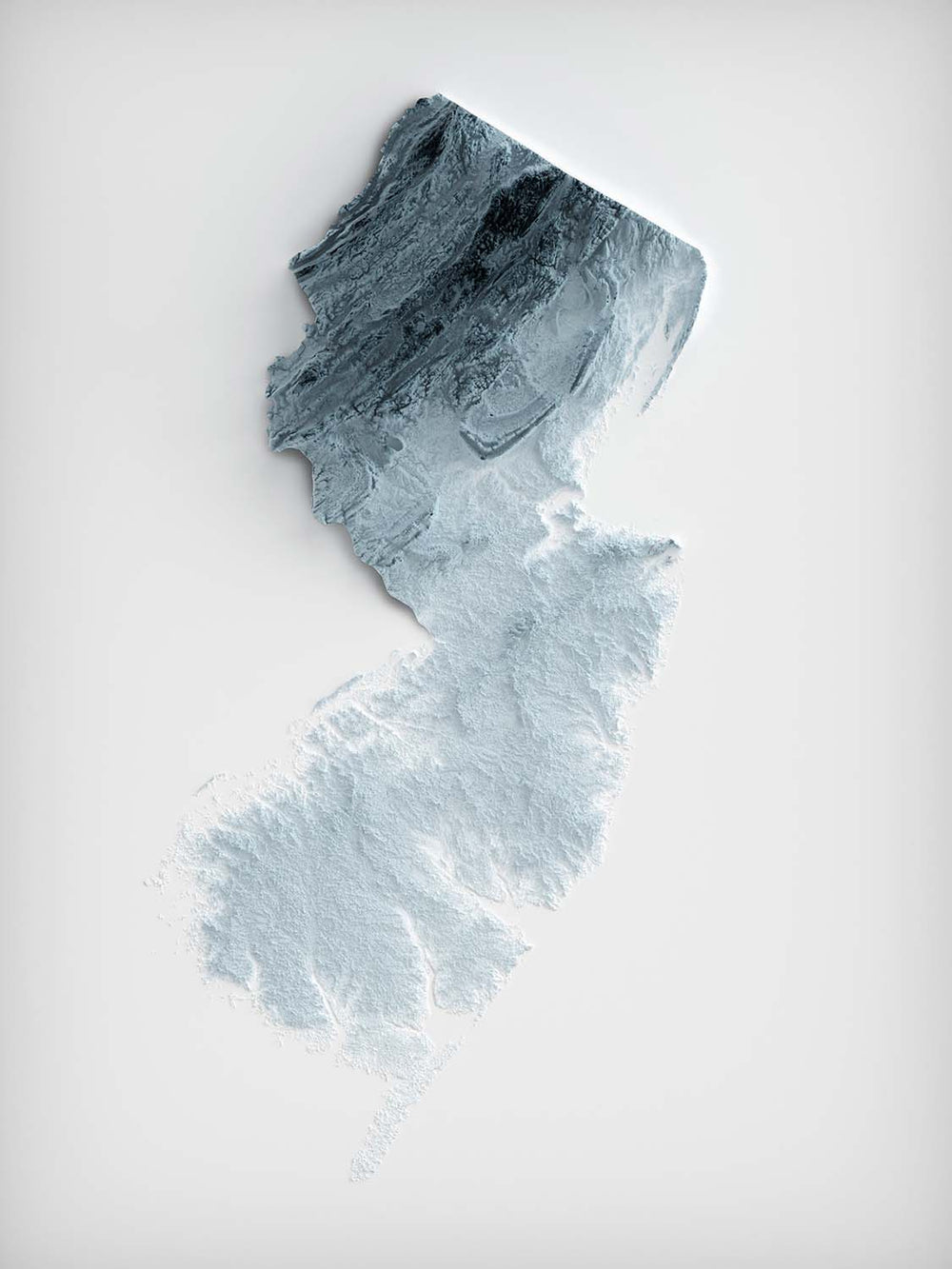 Las distintivas penínsulas, bahías y ensenadas de Nueva Jersey, desde Sandy Hook hasta Cape May, están claramente definidas, mostrando la intrincada costa y los humedales del estado. La interacción de sombras y puntos altos muestra artísticamente la variedad de entornos: desde las bulliciosas crestas del noroeste, a través de los fértiles valles centrales, hasta los tranquilos tramos del sur que conducen a playas interminables e islas barrera.