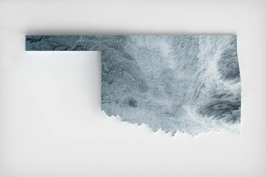 Los poderosos ríos Arkansas, Canadian y Red tallan amplios y serpenteantes caminos a través del paisaje, sus cursos grabados en sombras de bajo relieve que trazan el agua vital a través de campos agrícolas y espacios salvajes. Patrones sutiles también revelan los muchos lagos y embalses del estado, anidados en valles y tierras bajas.