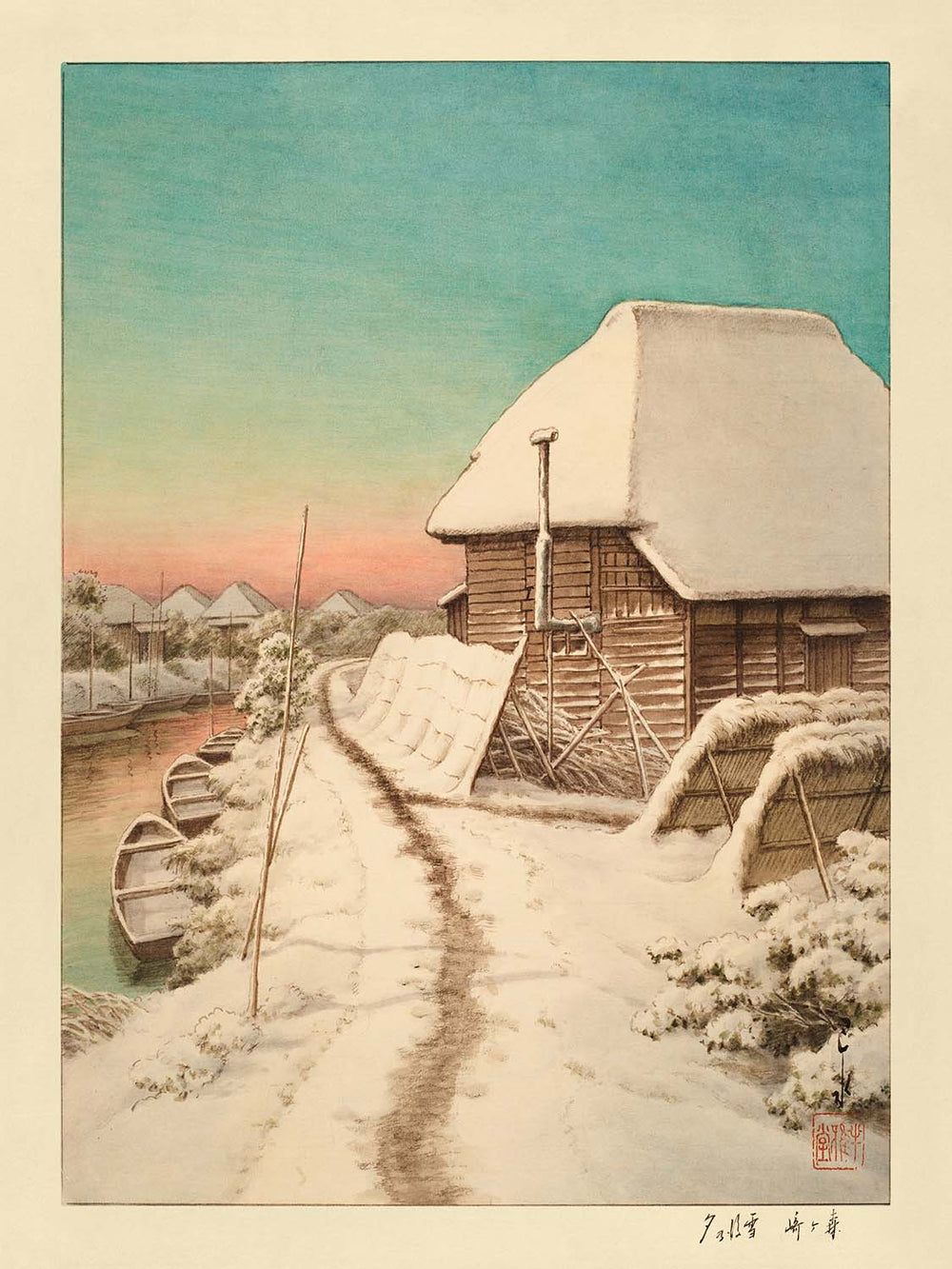 El cielo del atardecer después de la nieve en Morigasaki de Hasui Kawase es una impresión en madera silenciosamente luminosa de 1935 que representa bellamente el movimiento shin-hanga en el Japón de principios del siglo XX. En japonés, la obra de arte se conoce como “Morigasaki Setsugo no Yu” (森霞雪後の夕), y captura un paisaje tranquilo, cubierto de nieve, justo después de una nevada reciente, iluminado por el tenue resplandor del atardecer. Hasui Kawase, celebrado por sus paisajes poéticos y evocadores, invita aquí a los espectadores a un momento de quietud, heredado tanto del ukiyo-e tradicional como de las sensibilidades atmosféricas modernas.