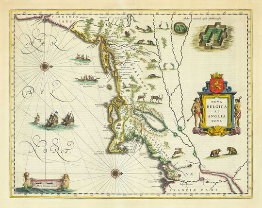 Mapa antiguo de Nueva Holanda y Nueva Inglaterra en 1640 por Willem Blaeu: Manhattan, Providence, Nueva York, Boston, Nueva Jersey