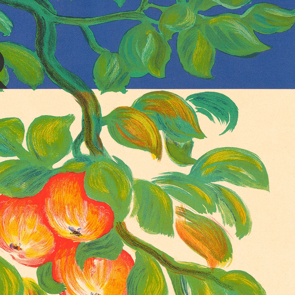 Design and color: Dominated by cool blues and fresh greens, with vibrant accents of orange, the palette captures the rhythm of the seasons—blue for alpine air and distant lake light, green for flourishing hillsides, and orange for autumnal warmth and the poster’s central flame-like motif. Scherer’s clean, sans-serif lettering anchors the image, while floral and fruit details lend organic texture. The seasonal panels are juxtaposed with striking economy, creating a brisk visual pace that mirrors the ease of rail travel. It’s an eloquent blend of Swiss graphic clarity and expressive color—equally at home in modern, eclectic, or vintage-inspired interiors.