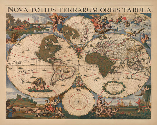 En esencia, la "Nova Totius Terrarum Orbis Tabula" es más que un mapa; es una ventana al pasado, ofreciendo perspectivas sobre las aspiraciones y las imaginaciones de aquellos que trazaron lo desconocido. Su mezcla de cartografía precisa y elementos especulativos invita a los espectadores a explorar no solo el mundo físico, sino también las posibilidades ilimitadas que yacen más allá del horizonte. Este mapa es una verdadera pieza de colección, una celebración del espíritu aventurero que continúa inspirando a exploradores e historiadores por igual.