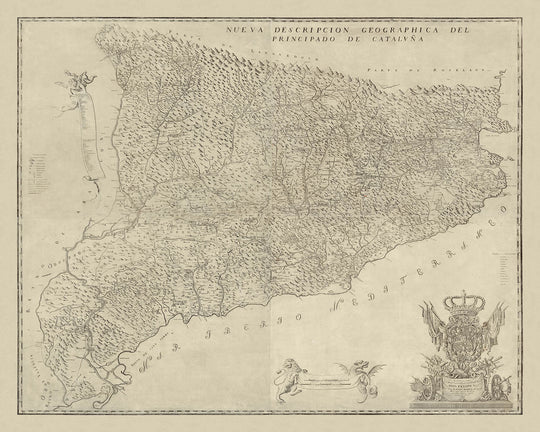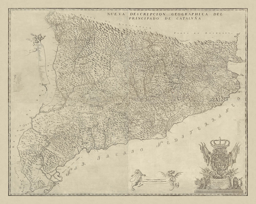 Josep Aparici was not merely a mapmaker but a pivotal figure in the administrative transformation of Catalonia. As a trusted official under the Bourbon monarchy, Aparici traversed the region in the wake of the War of Spanish Succession, meticulously gathering data for the new corregiments—administrative divisions imposed after the Bourbon victory. His map is a vivid chronicle of this era, revealing both the physical grandeur of the Pyrenees and the Mediterranean coastline, as well as the newly imposed political order. Aparici’s allegiance to King Felipe V is unmistakably woven into the map’s very fabric, with an elaborate cartouche that celebrates Bourbon triumph and authority.