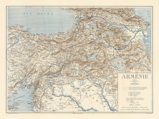 The “Carte de Arménie” is a rich tapestry of physical and political geography. It showcases the storied landscapes of the Armenian Highlands, with the majestic Mount Ararat rising as a symbol of national identity. The map’s careful rendering of Lake Van, Lake Sevan, and Lake Urmia, along with the sweeping contours of the Black Sea and Caspian Sea, anchors Armenia within its broader regional context. The inclusion of vital railroads and mountain ranges underscores the strategic importance of these lands, both as a crossroads of civilizations and as a homeland for generations of Armenians.