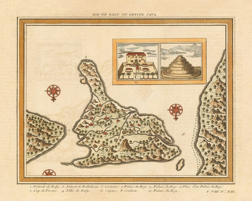 Los hitos políticos y culturales significativos están meticulosamente marcados, con los palacios del Rey exhibidos de manera prominente, indicando los centros de poder de la isla. La inclusión de una clave o leyenda proporciona claridad al rico tapiz de nombres de lugares y características del mapa, mientras que las ilustraciones de un palacio y un templo añaden una capa de intriga visual. Estos elementos no solo mejoran el atractivo estético del mapa, sino que también sirven como marcadores históricos de la importancia de Bali en el comercio y la exploración.
