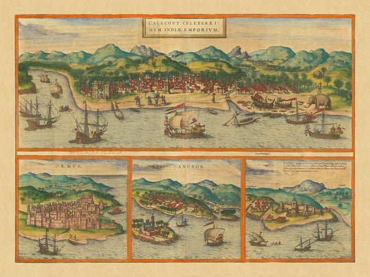 Antigua mapa de Calicut en India por Braun & Hogenberg, 1572: Ormuz, Canonor, El Mina, barcos