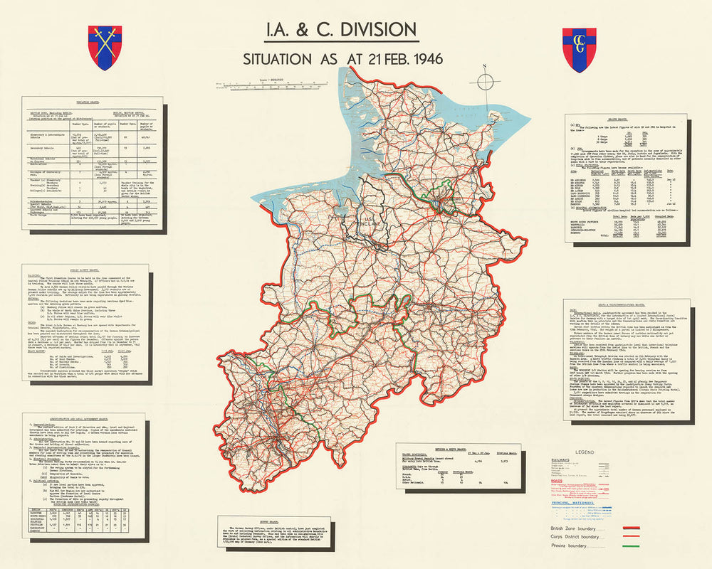 Step into a pivotal moment in twentieth-century history with this exceptional map, "I.A. & C. Division Situation As At 21 Feb. 1946," a rare artifact from the immediate aftermath of the Second World War. Created by the British Information and Civil Division, this map offers a detailed and authoritative view of the British Zone of Occupation in northwest Germany, a region undergoing profound transformation. Spanning from Cologne in the south to the Danish border in the north, and encompassing such major cities as Hamburg, Hannover, and Bremen, the map captures the complexity of governance, reconstruction, and denazification efforts at a time when Europe was striving to rebuild from the ashes of conflict.