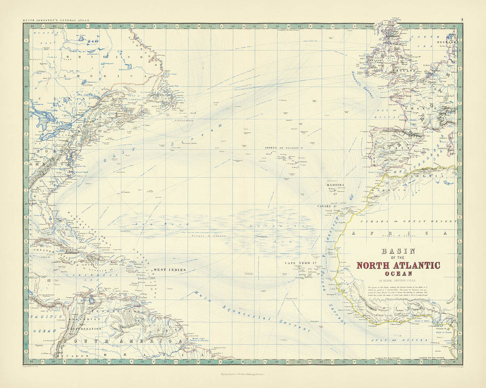 Basin of the North Atlantic, issued in 1861 by W. & A.K. Johnston, captures the oceanic heart of the nineteenth-century world with a scholar’s precision and an artist’s poise. The esteemed Johnston firm—renowned for elevating atlases into objects of enduring reference—organizes the vast theater between North America, Europe, and Northern Africa into a legible, luminous whole. Pastel washes gently differentiate lands and waters while preserving a wealth of fine detail, from coastal intricacies to the careful placement of cities and settlements. A distinctive Piano Key border frames the composition, underscoring the period’s taste for ornamented clarity and lending the chart a refined cadence that complements its deeply informative purpose.